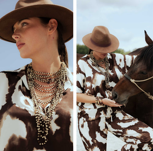 Nog een sterk motief van het seizoen: de vlekkenprint, geïnspireerd op koeienhuid . Bij Paprika vonden we hem licht, gestileerd en vol beweging, gedragen door vloeiende snitten en warme tinten zoals bruin, dé kleur van dit moment. Deze print speelt met westerse codes zonder ooit karikaturaal te worden: hij roept het cowgirl-universum op met elegantie en moderniteit.